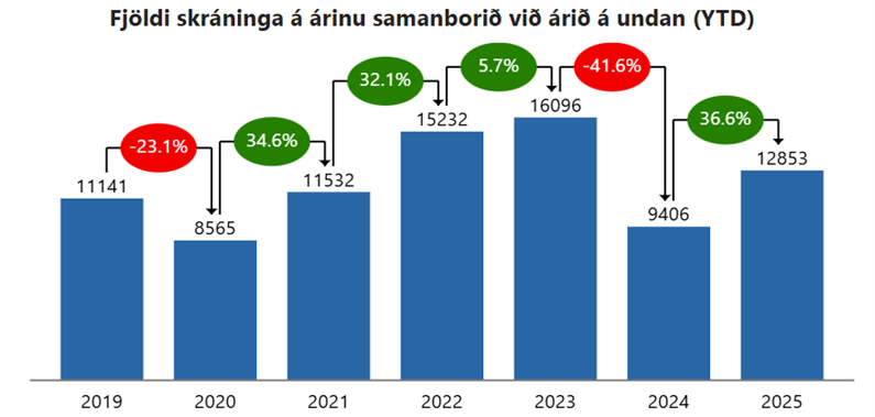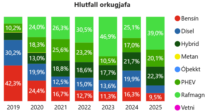 Heilt yfir hefur verið góður taktur í nýskráningum fólksbíla það sem af er ári og hafa samtals 12.853 nýir fólksbílar verið skráðir sem er 36,6% aukning samanborið við sama tímabil í fyrra. Algengasti orkugjafinn er rafmagn en meira en 1 af hverju 3 nýjum fólksbílum eru alfarið knúinn rafmagni. Þar á eftir koma tvinnbílar (e. hybrid) og tengiltvinnbílar (e. PHEV). Rétt er að taka fram að þær blikur sem eru á lofti í efnahagslífinu geta einnig haft töluverð áhrif á bílasölu komi þær fram í kaupmætti almennings og fyrirtækja.