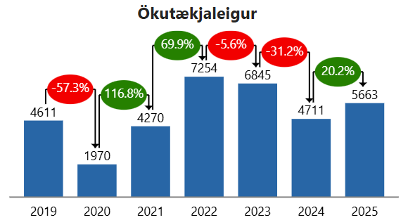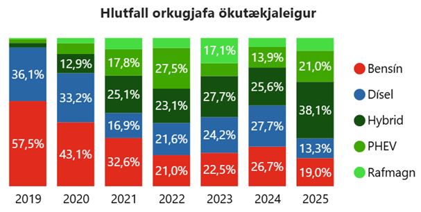Ökutækjaleigur hafa skráð það sem af er ári 5.663 nýja fólksbíla sem er 20% aukning milli ára. Hlutfall bílaleigubíla í nýskráningum nýrra fólksbíla er um 44% það sem af er ári. Algengasti orkugjafinn er tvinnbílar (e. hybrid) og þar á eftir koma tengiltvinnbílar (e. PHEV).