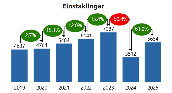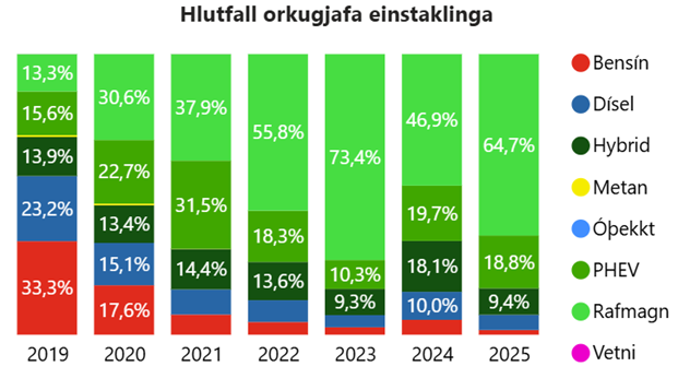 Einstaklingar hafa nýskráð 5.654 nýja fólksbílar það sem af er ári sem er 61% aukning milli ára. Orkuskipti einstaklinga eru í fullum gangi en 65% nýrra fólksbíla eru alfarið knúnir rafmagni og um 19% eru tengiltvinnbílar.