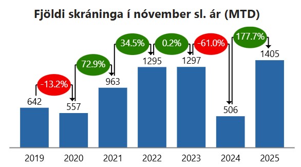 Í nóvember voru nýskráðir alls 1.405 nýir fólksbílar. Fjöldi nýskráninga í nóvember er meiri en tíðkast öllu jafna í mánuðinum líkt og sjá má á myndinni hér að neðan. Líkleg skýring á þessari aukningu eru viðbrögð heimila og fyrirtækja við tillögum fjármála- og efnahagsráðuneytisins um hækkun vörugjalda á ökutæki sem kynntar voru upp úr miðjum október sl. Reynslan sýnir að þegar skattahækkanir hafa verið boðaðar á innflutning ökutækja færist hluti fyrirhugaðra bílakaupa fram og á sér stað áður en skattahækkanir taka gildi. Má gera ráð fyrir að nýskráningar í desember verði einnig vel umfram það sem tíðast hefur þann mánuðinn. Það mun væntanlega á móti leiða til þess að nýskráningar á næsta ári dragist saman sem því nemur. Þá segir reynslan okkur einnig að vörugjaldshækkanir á nýjum bílum hafa tilhneigingu til að koma fram í formi hækkana á eftirmarkaði. Þannig er afar hætt við að sveiflur á bílamarkaði muni aukast , a.m.k. tímabundið.