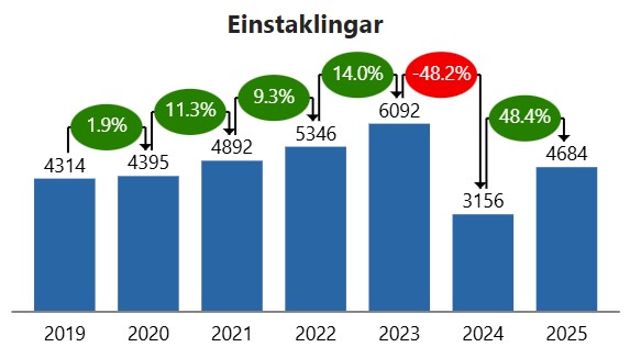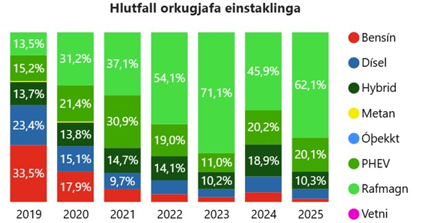 Einstaklingar keyra áfram vöxtinn í nýskráningu fólksbíla á milli ára. Alls hafa þeir nýskráð 4.684 nýja fólksbíla það sem af er ári sem er 48% aukning milli ára. Orkuskipti einstaklinga eru í fullum gangi og er 62% af nýjum fólksbílum rafmagnsbílar og um 20% tengiltvinnbílar. Hlutfall rafbíla samanlagt er búið að ná fyrra hámarki og er um 82% af nýskráningum einstaklinga.