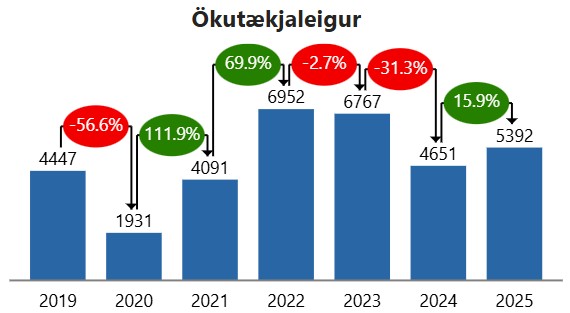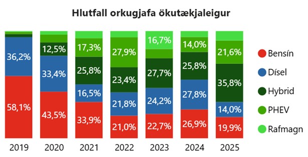 Ökutækjaleigur eru áfram stærsti kaupendahópur nýrra fólksbíla. Það sem af er ári er búið að nýskrá 5.392 bílaleigubíla og fjölgaði þeim um 16% milli ára. Tvinnbílar (e. hybrid) eru algengastir og þar á eftir tengiltvinnbílar (PHEV).