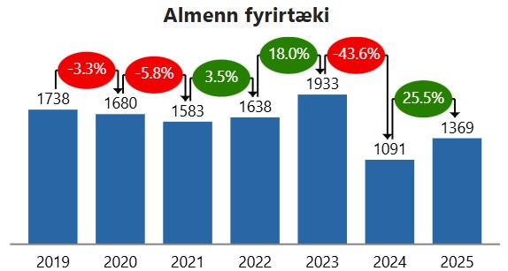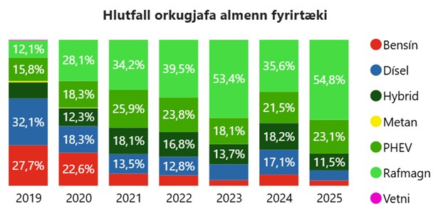 Fyrirtæki (önnur en ökutækjaleigur) hafa nýskráð 1.369 nýja fólksbíla það sem af er ári sem er 26% aukning milli ára. Rafmagn er algengasti orkugjafinn með um 55% hlutdeild og þar á eftir koma tengiltvinnbílar með 23% hlutdeild.