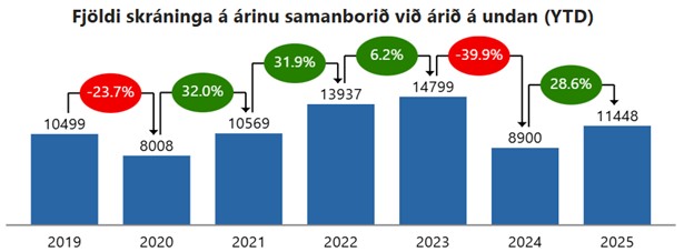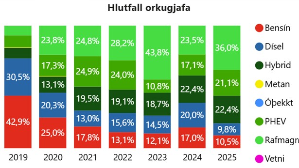 Það voru 760 nýir fólksbílar skráðir í október og samtals 11.448 það sem af er ári. Það eru 2.548 fleiri fólksbílar en á sama tíma í fyrra og jafngildir 28,6% aukningu milli ára. Aukningin er á breiðum grunni, bæði hjá einstaklingum og fyrirtækjum, eftir rólegt ár í fyrra. Rafmagn er algengasti orkugjafinn það sem af er ári með 36% hlutdeild í nýskráningum sem þýðir að meira en 1 af hverjum 3 nýjum fólksbílum er að fullu rafknúinn.