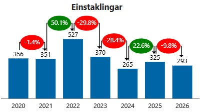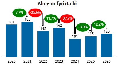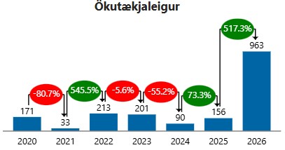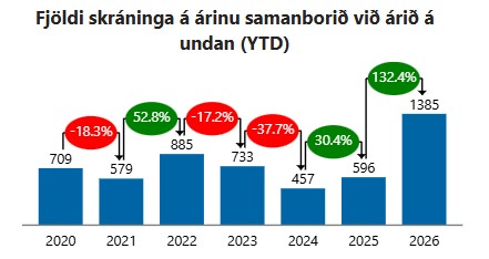 Í janúar voru nýskráðir 1.385 nýir fólksbílar sem jafngildir 132% aukningu miðað við janúar 2025. Aukningin er að stórum hluta drifin áfram af ökutækjaleigum. Um áramótin tóku gildi umtalsverðar breytingar á vörugjaldi á ökutæki sem varð til þess að veruleg aukning varð í innflutningi ökutækja undir árslok. Hluti þeirra bifreiða sem fluttar voru inn fyrir gildistöku breytinganna var þó ekki nýskráður á þeim tíma heldur má búast við að sá hluti verði nýskráður á fyrri hluta þessa árs. Það er líklegt að aukning nýskráninga í janúar endurspegli að stórum hluta þessa þróun, þ.e. komi til vegna aukins innflutnings á síðasta ári fremur en hún sé merki um verulega aukningu í eftirspurn ökutækjaleiga svo snemma á árinu.