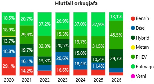 Þegar litið er til orku- og driflausna þá voru tengiltvinnbílar (e. PHEV) algengastir meðal nýskráðra fólksbíla og þar á eftir tvinnbílar (e. Hybrid). Þessir tveir flokkar ökutækja urðu fyrir mestum áhrifum af vörugjaldabreytingunum um áramótin. Bílgreinasambandið hefur sérstaklega bent á að breytingarnar muni hafa verulega neikvæð áhrif á tengiltvinnbíla. Það helgast annars vegar af verulegri hækkun vörugjalds og hins vegar af breytingum á aðferðafræði við prófun ökutækja sem leiðir til hærri skattskyldrar losunar og þar með aukinnar skattbyrði kaupenda.